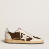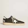 Sognando gli anni Ottanta. Le nostre sneaker Ball Star si rifanno all’atmosfera dei college americani, tra un tiro a canestro e un giro in skateboard. Con la tomaia in nylon color argento con inserti in pelle laminata ton sur ton, questo modello da uomo si distingue per la stella e per il talloncino in pelle lucida verde. E come tocco finale, i lacci color grigio ghiaccio: le cose belle che non passano mai di moda.