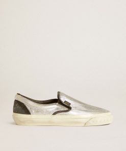 Golden Goose Vce Penstar Uomo In Pelle Laminata Argento Con Talloncino In Pelle Nera | Uomo Scarpe