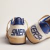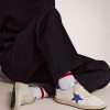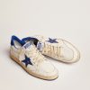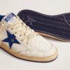 Sognando gli anni Ottanta. Le nostre sneaker Ball Star si rifanno all’atmosfera dei college americani, tra un tiro a canestro e un giro in skateboard. Questa versione in nappa bianca si caratterizza per la stella e il talloncino in pelle laminata color bluette e per gli inserti in pelle bianca cracklé. E come tocco finale, i lacci bianchi.