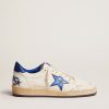 Sognando gli anni Ottanta. Le nostre sneaker Ball Star si rifanno all’atmosfera dei college americani, tra un tiro a canestro e un giro in skateboard. Questa versione in nappa bianca si caratterizza per la stella e il talloncino in pelle laminata color bluette e per gli inserti in pelle bianca cracklé. E come tocco finale, i lacci bianchi.