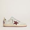 Sognando gli anni Ottanta. Le nostre sneaker Ball Star si rifanno all’atmosfera dei college americani, tra un tiro a canestro e un giro in skateboard. Questo modello realizzato in pelle nabuk bianca stampa cocco si caratterizza per la stella in suede bordeaux e il talloncino in pelle laminata oro. E come tocco finale, l’inserto in suede color bianco vissuto, i lacci grigi e la scritta Sneakers sul tallone in font “metal” bordeaux.