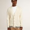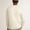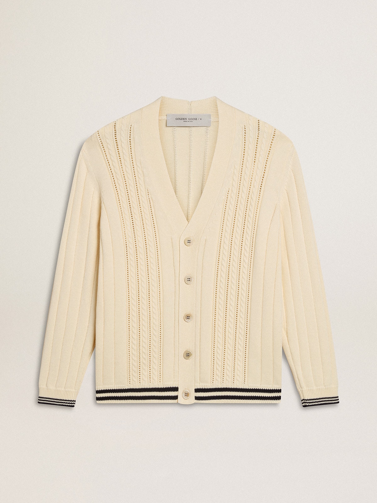 Ispirata all’energia degli anni Novanta, la nostra nuova collezione celebra l’energia pulsante della musica e la forza illimitata dei sogni. In cotone color bianco vissuto, questo cardigan da uomo è caratterizzato da un motivo intrecciato sul davanti e da costine a strisce blu scuro sul profilo inferiore e sulle maniche.
