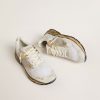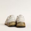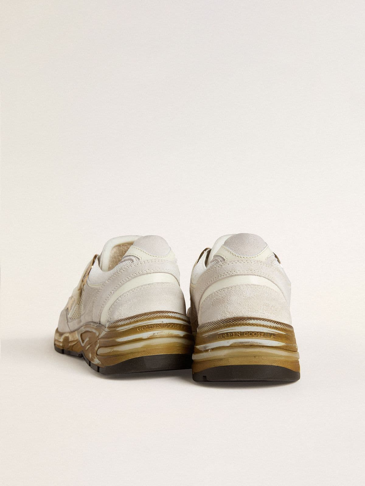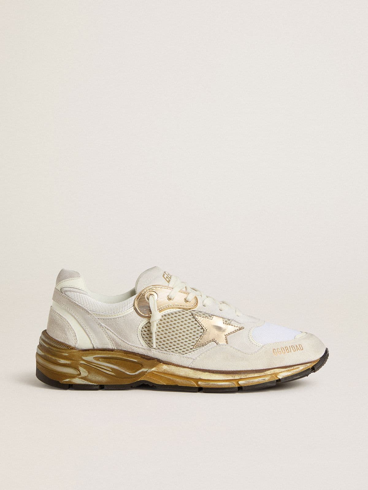 Un’anima ricca di storie: le nostre sneaker Dad-Star hanno uno stile senza tempo, creato per essere tramandato di generazione in generazione. Questa versione si caratterizza per la tomaia in rete e suede bianca accentuata da inserti in pelle bianchi, dalla stella in pelle laminata dorata e il talloncino in suede bianco. E come tocco finale, i passanti per i lacci dorati, e i lacci bianchi.