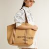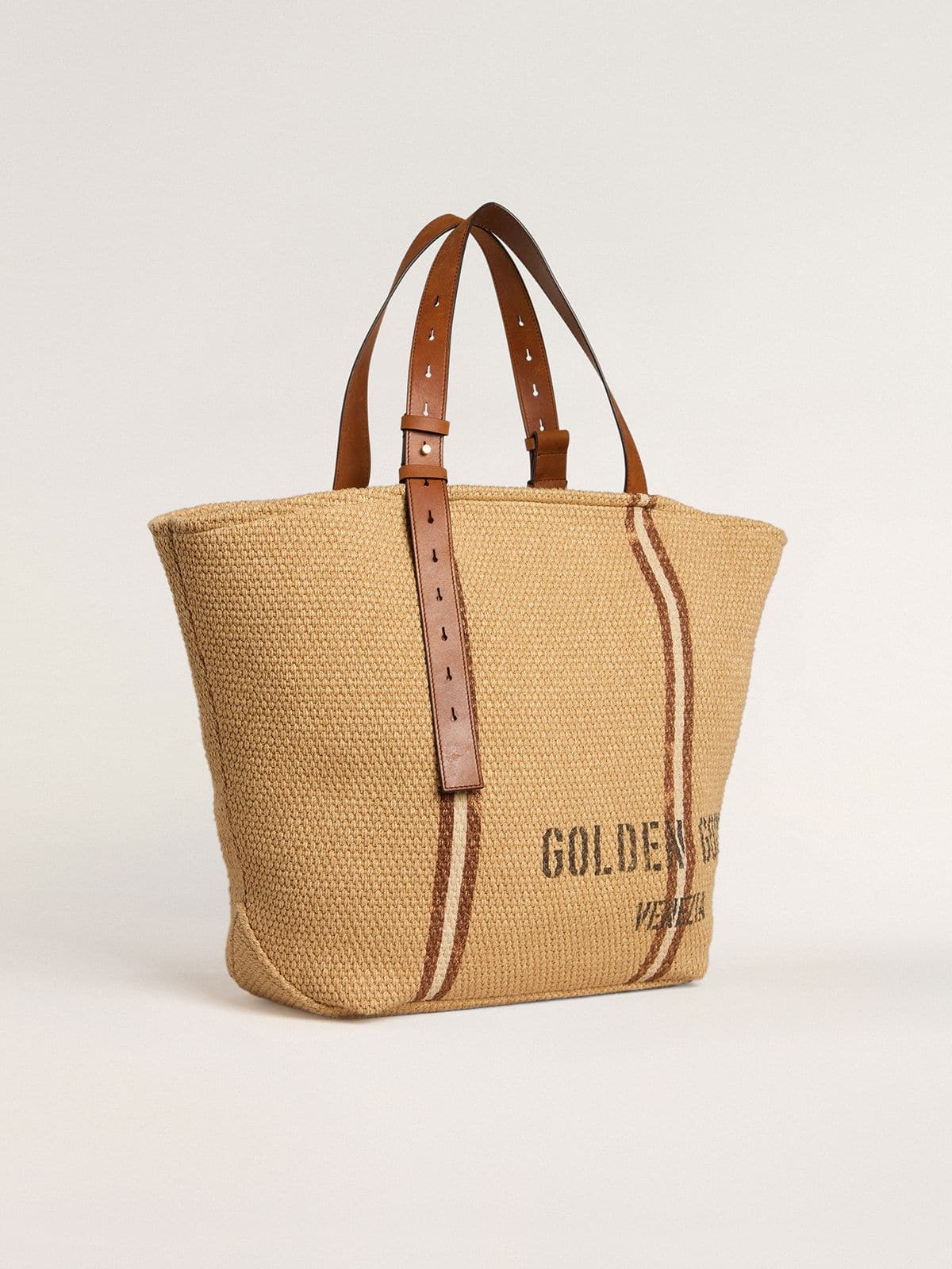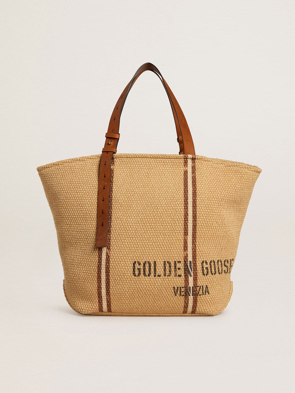 La Collezione Resort 2025 riscopre la bellezza del lifestyle mediterraneo. Un omaggio ai ritmi lenti, ai dettagli vissuti e a quei gesti quotidiani che trasformano la semplicità in eleganza disinvolta.In rafia naturale resinata con manici in pelle marrone, questa borsa tote si distingue per la stampa con righe verticali bianche e color cuoio e per la scritta “Golden Goose Venezia” stampata sul davanti. L’interno non foderato include una pouch rimovibile in pelle, utilizzabile anche separatamente. Dettagli metallici dorati completano il design con un accento pratico e distintivo.