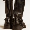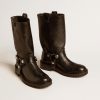 Un’icona di stile senza tempo. I nostri stivali in pelle uniscono artigianalità italiana e carattere deciso, per un look audace e sofisticato che non passa inosservato.Questa versione si caratterizza per la tomaia in pelle nera lucida, per la fibbia in metallo con galvanica color argento, e per i cinturini in pelle nera alla caviglia. A completare lo stile, le borchie con galvanica color argento.
