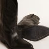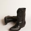 Dal Texas a Venezia: i nostri Stivali Wish Star raccontano il nostro viaggio e le nostre passioni, creando un connubio unico tra tradizione artigianale veneziana e spirito Western. In versione bassa, questi stivali sono caratterizzati dalla tomaia in pelle nera con stella a intarsio in pelle nera, e dai ricami con impunture ton sur ton sul gambale. A completare lo stile, il dettaglio con piping nero e la placchetta in metallo color oro con firma Golden Goose incisa sul tacco.