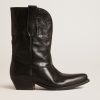 Dal Texas a Venezia: i nostri Stivali Wish Star raccontano il nostro viaggio e le nostre passioni, creando un connubio unico tra tradizione artigianale veneziana e spirito Western. In versione bassa, questi stivali sono caratterizzati dalla tomaia in pelle nera con stella a intarsio in pelle nera, e dai ricami con impunture ton sur ton sul gambale. A completare lo stile, il dettaglio con piping nero e la placchetta in metallo color oro con firma Golden Goose incisa sul tacco.