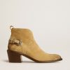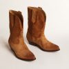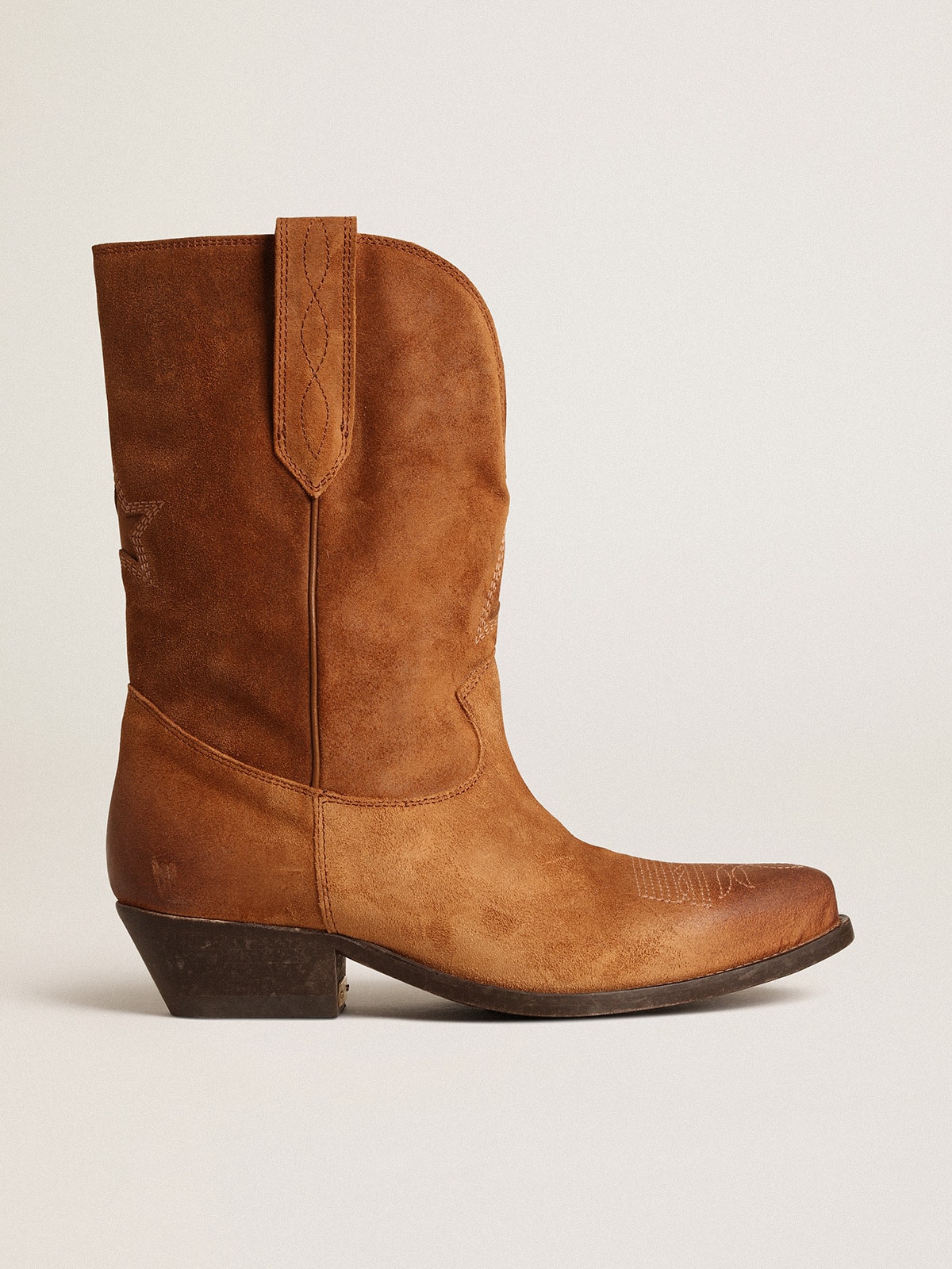 Dal Texas a Venezia: i nostri Stivali Wish Star raccontano il nostro viaggio e le nostre passioni, creando un connubio unico tra tradizione artigianale veneziana e spirito Western. In versione bassa, questi stivali sono caratterizzati dalla tomaia in suede color cognac con stella a intarsio, e dalle impunture ton sur ton sul gambale e sulla punta. A completare lo stile, il dettaglio con piping ton sur ton e la placchetta in metallo color oro con firma Golden Goose incisa sul tacco.