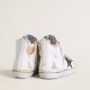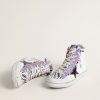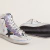 Gli anni Settanta, oggi: ispirate al mondo del basket, lo stile delle Francy viene rinnovato da dettagli inaspettati e trattamenti speciali. Con la tomaia in pelle bianca dall’effetto distressed accentuata da borchie multicolori, queste sneaker LAB da uomo si caratterizzano per la stella in pelle lucida nera e per l’inserto in cavallino color lilla. A completare lo stile, la linguetta in pelle bianca con stampa geometrica nera a contrasto, la punta in gomma bianca, la doppia riga gialla e azzurra sul foxing, e i lacci bianchi.