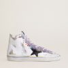 Gli anni Settanta, oggi: ispirate al mondo del basket, lo stile delle Francy viene rinnovato da dettagli inaspettati e trattamenti speciali. Con la tomaia in pelle bianca dall’effetto distressed accentuata da borchie multicolori, queste sneaker LAB da uomo si caratterizzano per la stella in pelle lucida nera e per l’inserto in cavallino color lilla. A completare lo stile, la linguetta in pelle bianca con stampa geometrica nera a contrasto, la punta in gomma bianca, la doppia riga gialla e azzurra sul foxing, e i lacci bianchi.