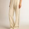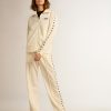 Una collezione dall’anima casual, ma dall’attitude versatile: ispirata agli anni Settanta, porta con sé un allure vintage senza tempo, adatto a ogni occasione e a ogni look. Ispirato al mondo sartoriale, richiamato dalla piega impunturata sul davanti, questo pantalone jogging in jersey tecnico di colore bianco papiro si caratterizza per la gamba affusolata. E come tocco finale, il nastro in gros grain di colore bianco sui lati delle gambe con stelle nere a contrasto.