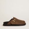 Nato dal desiderio di fondere comfort e carattere, il sabot Lucy reinterpreta una silhouette iconica secondo i codici della nuova quotidianità.Complici di uno stile senza tempo, i Lucy trasformano ogni passo con il loro volume deciso e il dettaglio signature con logo inciso.Con la tomaia in suede color tortora, questa versione da donna si distingue per la suola scolpita e per il cinturino in suede ton sur ton con fibbia e dettagli in metallo dorato.