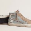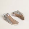 Anima skate, attitude glamour. Le nostre sneaker Slide ti trasportano direttamente a Venice Beach, tra un ollie e un kickflip. Con la tomaia in canvas azzurro con inserti in pelle marroni, questo modello si distingue per la stella in pelle bianca e per il talloncino in suede marrone. A completare lo stile, la virgola in pelle laminata argento, e i lacci marroni.
