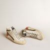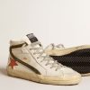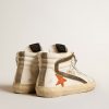 Anima skate, attitude glamour. Le nostre sneaker Slide ti trasportano direttamente a Venice Beach, tra un ollie e un kickflip. Con la tomaia in nappa bianca, questo modello si distingue per la stella in nappa con stampa coccodrillo color arancione e per gli inserti in suede color verde militare, come il talloncino e la virgola con i bordi in pelle laminata color oro. A completare lo stile, i lacci color grigio ghiaccio.