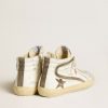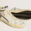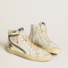 Anima skate, attitude glamour. Le nostre sneaker Slide ti trasportano direttamente a Venice Beach, tra un ollie e un kickflip. Con la tomaia in pelle bianca, questo modello da uomo si distingue per la stella e la la virgola in suede marrone dal trattamento distressed. A completare lo stile, i lacci color bianco vissuto con il finalino di colore rosso.