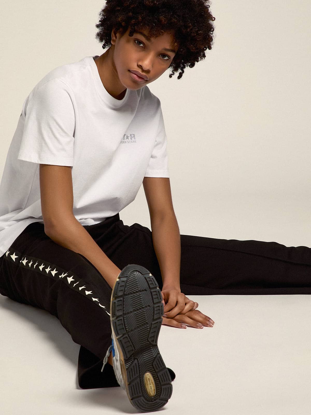 Una collezione dall’anima casual, ma dall’attitude versatile: ispirata agli anni Settanta, porta con sé un allure vintage senza tempo, adatto a ogni occasione e a ogni look. Girocollo e dal fit regular, questa T-shirt in puro cotone bianco si caratterizza per il logo sul davanti e la maxi stella sul retro, entrambi in glitter argento. Il giusto tocco di preziosità per illuminare le tue avventure quotidiane.