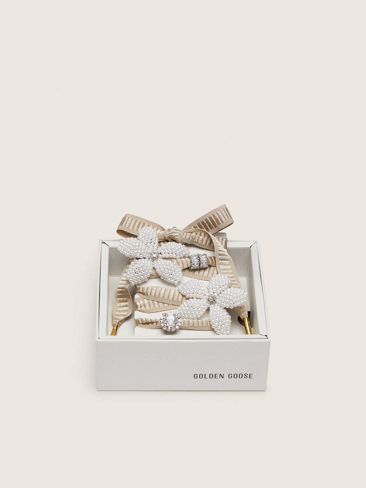 Personalizza le tue sneakers preferite con le “Skins”, i nostri lacci impreziositi, pensati per esprimere il tuo stile unico attraverso accessori e colori pronti a stupire. Questo modello Sparkling si compone di un laccio ricamato di colore beige, arricchito da alcuni charm: due di perline bianche a forma di fiore e altri a forma di piccoli cristalli. L’accessorio ideale per esaltare la tua personalità.