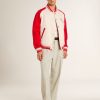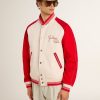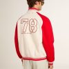 Abbracciando l’essenza della stagione, questa Collezione esprime dinamismo e libertà, intrecciando leggerezza raffinata e accenti vivaci. Questa giacca bomber in cotone di color bianco vissuto e rosso si caratterizza per la scritta ricamata ‘Golden Club’ sul cuore. E come tocco finale, i polsini, il collo e il fondo in costine dall’effetto sbiadito delle righe rosse, rendono questo capo unico nel proprio genere.
