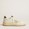 Sognando gli anni Ottanta. Le nostre sneaker Ball Star 2 si rifanno all’atmosfera dei college americani, tra un tiro a canestro e un giro in skateboard. Con la tomaia in pelle bianca, questo modello si distingue per la stella in suede color grigio ghiaccio e per il talloncino in pelle lucida nera. E come tocco finale, i lacci bianchi: le cose belle che non passano mai di moda.