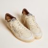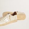 Sognando gli anni Ottanta. Le nostre sneaker Ball Star si rifanno all’atmosfera dei college americani, tra un tiro a canestro e un giro in skateboard. Con la tomaia in nappa bianca, questo modello si distingue per la stella in pelle laminata color argento e per il talloncino in suede marrone. E come tocco finale, gli inserti in pelle cracklé bianca, e i lacci bianchi: le cose belle che non passano mai di moda.