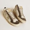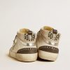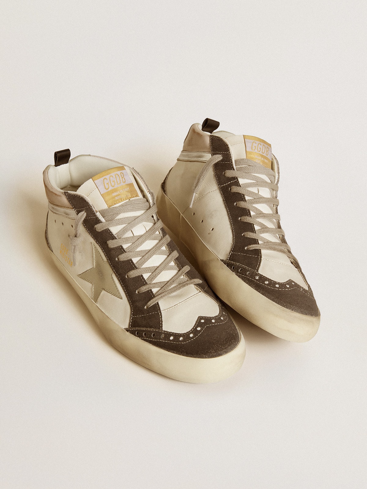 Versatilità dall’eleganza unica: le sneaker Mid Star s’ispirano alla scena skate degli anni Novanta, ma con un approccio raffinato. Con la tomaia in pelle bianca, questo modello si caratterizza per la stella e il talloncino in pelle grigia, e per la virgola in pelle laminata color argento. A completare lo stile, gli inserti in suede nero, e i lacci color grigio ghiaccio.