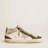 Versatilità dall’eleganza unica: le sneaker Mid Star s’ispirano alla scena skate degli anni Novanta, ma con un approccio raffinato. Con la tomaia in pelle bianca, questo modello si caratterizza per la stella e il talloncino in pelle grigia, e per la virgola in pelle laminata color argento. A completare lo stile, gli inserti in suede nero, e i lacci color grigio ghiaccio.