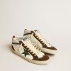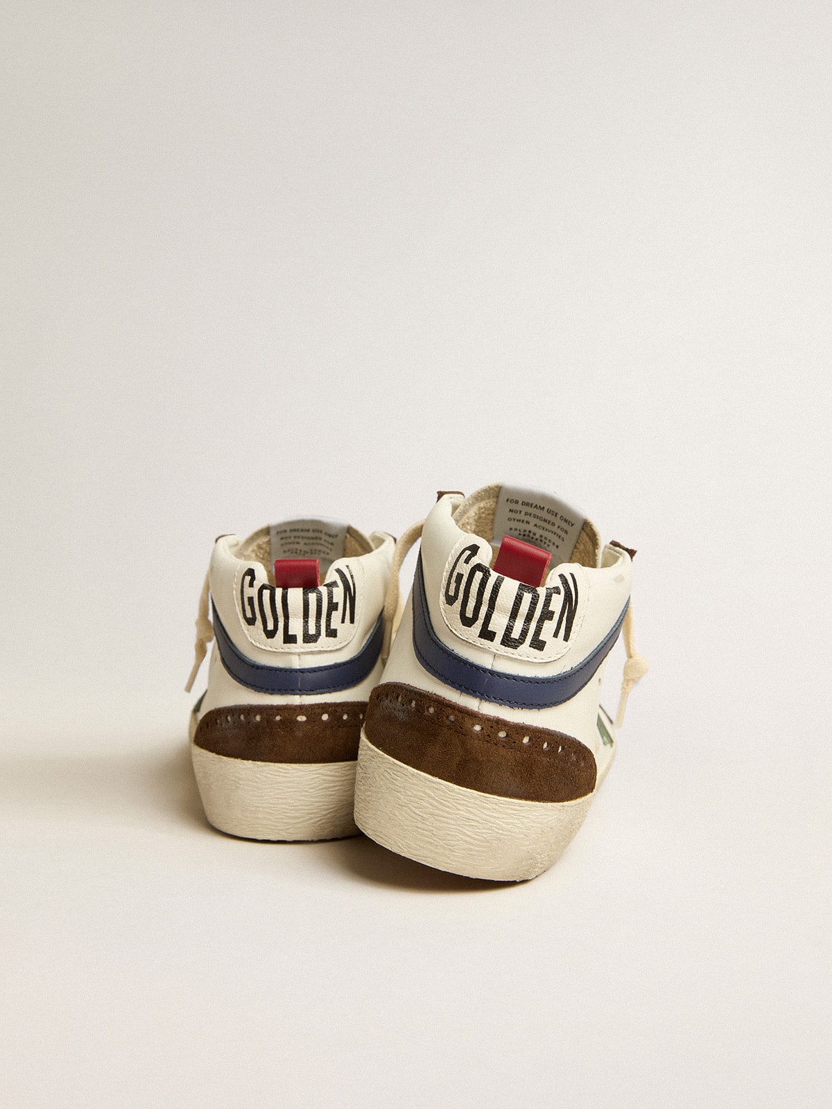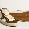Versatilità dall’eleganza unica: le sneaker Mid Star s’ispirano alla scena skate degli anni Novanta, ma con un approccio raffinato. Con la tomaia in pelle bianca, questo modello si caratterizza per la stella in pelle verde e per la virgola in pelle blu. A completare lo stile, il talloncino in nappa bianca, gli inserti in suede color marrone, e i lacci bianchi.