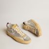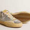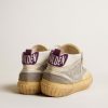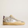 Versatilità dall’eleganza unica: le sneaker Mid Star s’ispirano alla scena skate degli anni Novanta, ma con un approccio raffinato. Con la tomaia in pelle laminata color argento con inserto in rete bianca, queste sneaker LAB si caratterizzano per la stella traforata ton sur ton, per il talloncino in suede viola e per gli inserti in suede color grigio ghiaccio con foratura all’inglese. A completare lo stile, la virgola in cotone color nude, la linguetta in gommapiuma color beige, e i lacci bianchi.